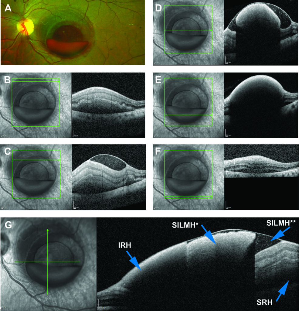 Fig. 1. Images of the left eye at presentation. A. Pseudocolor fundus photograph of the left eye (Optos ultra-widefield imaging device; Optos, Marlborough, MA). B to F. Horizontal optical coherence tomographic scans through the macula of the left eye. G. A vertical optic coherence tomographic scan through the macula of the left eye. IRH, intraretinal hemorrhage; SILMH*, clotted sub-internal limiting membrane hemorrhage; SILMH**, non-clotted sub-internal limiting membrane hemorrhage; SRH; subretinal hemorrhage.
